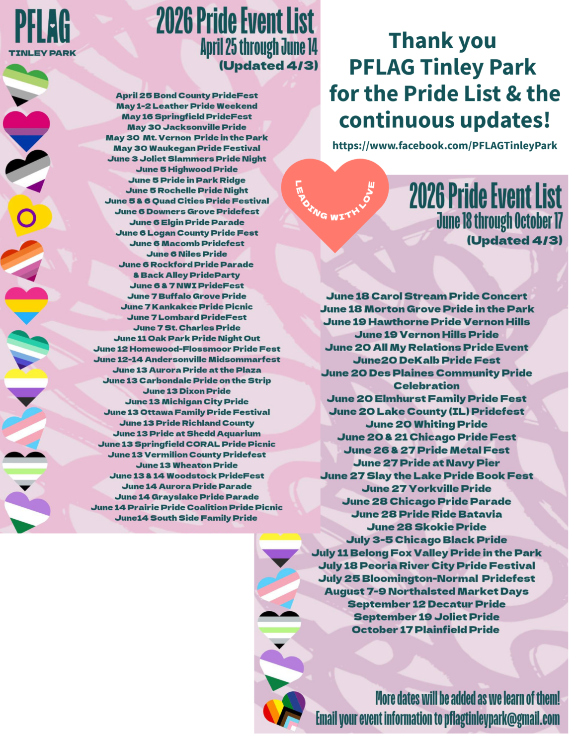 We thank PFLAG Tinley Park for keeping this list updated! The link takes you to their Facebook page for updated information.